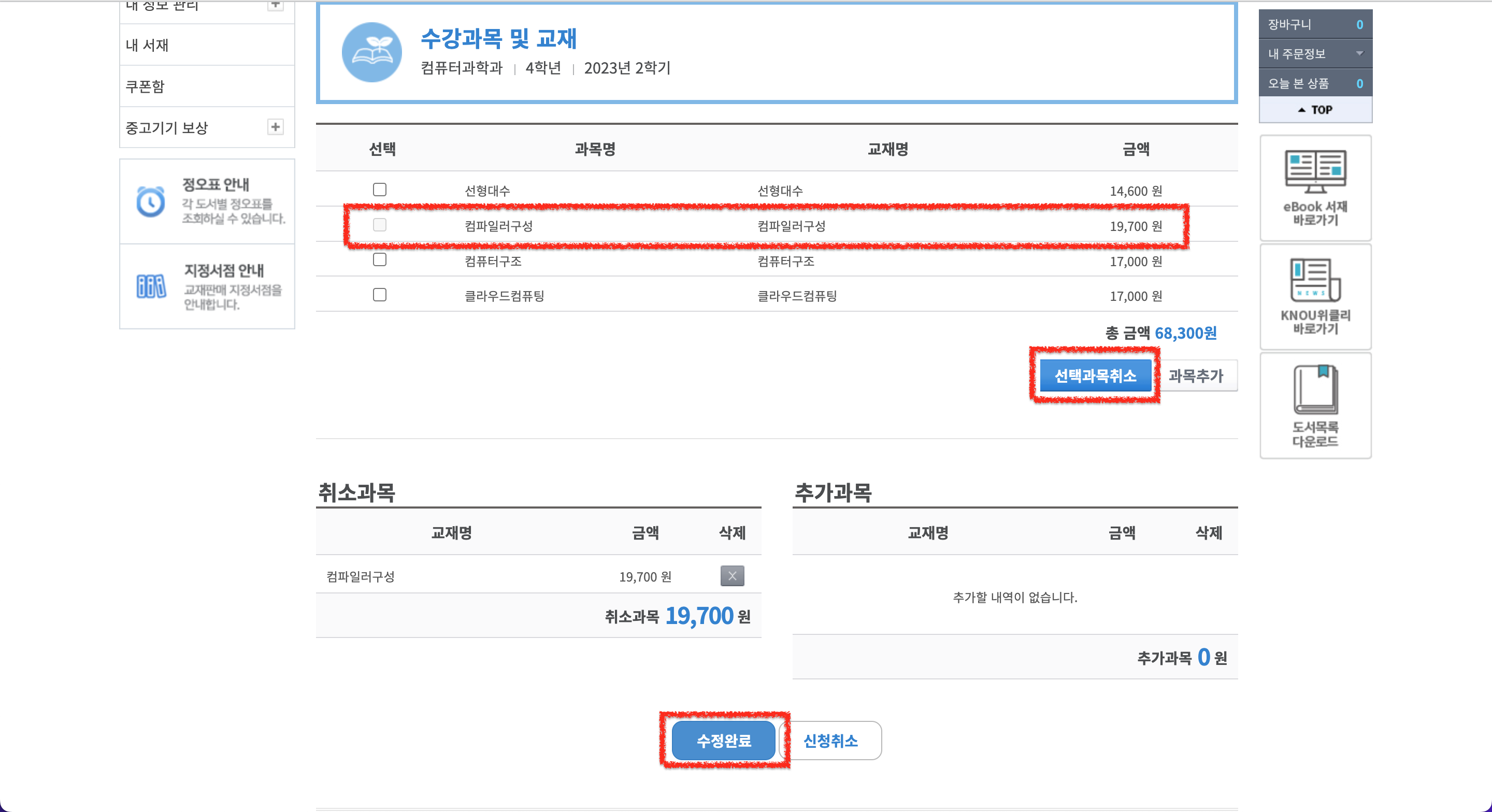 2. 구매를 원하지 않는 도서를 '선택과목취소' 선택 후 '수정완료' 선택