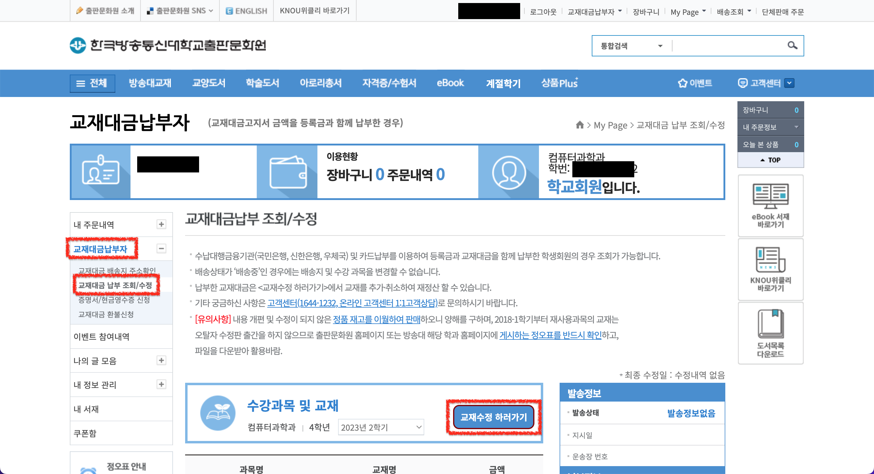 1. 출판문화원 > 교재대금납부자 > 교재대금 납부 조회/수정