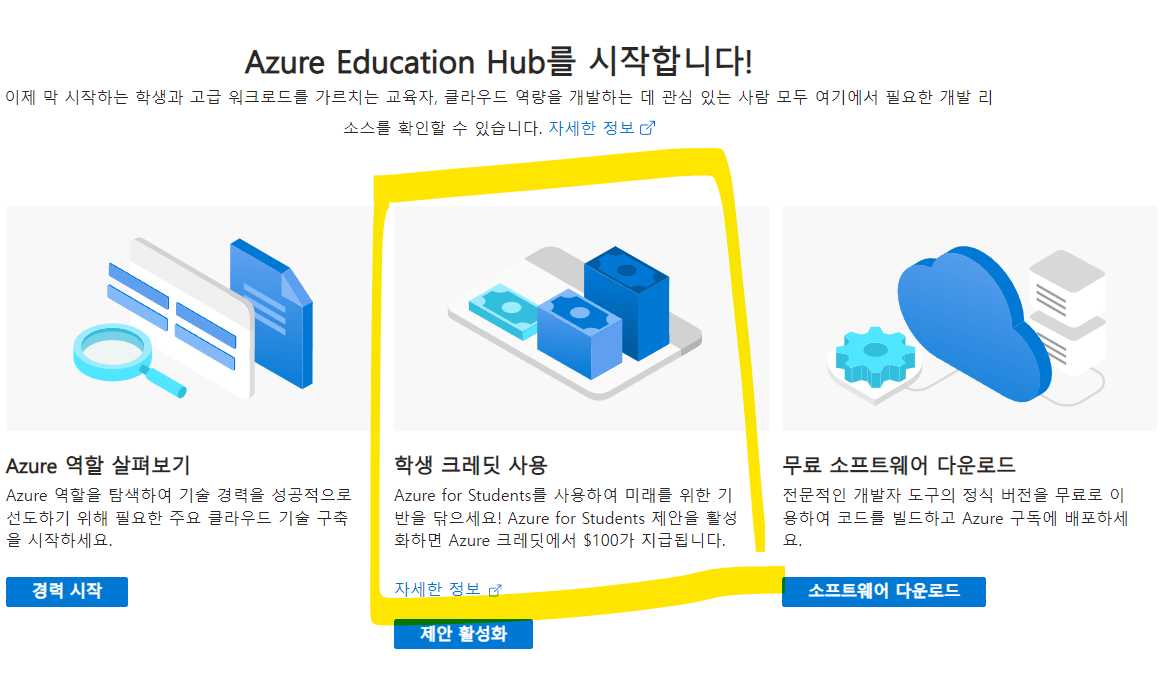 1. ~ac.kr로 끝나는 이메일 주소를 사용하여 마이크로소프트 계정 생성 후 애져 로그인 (이 때 구글에 Azure for Students를 검색해서 들어가야 한다)