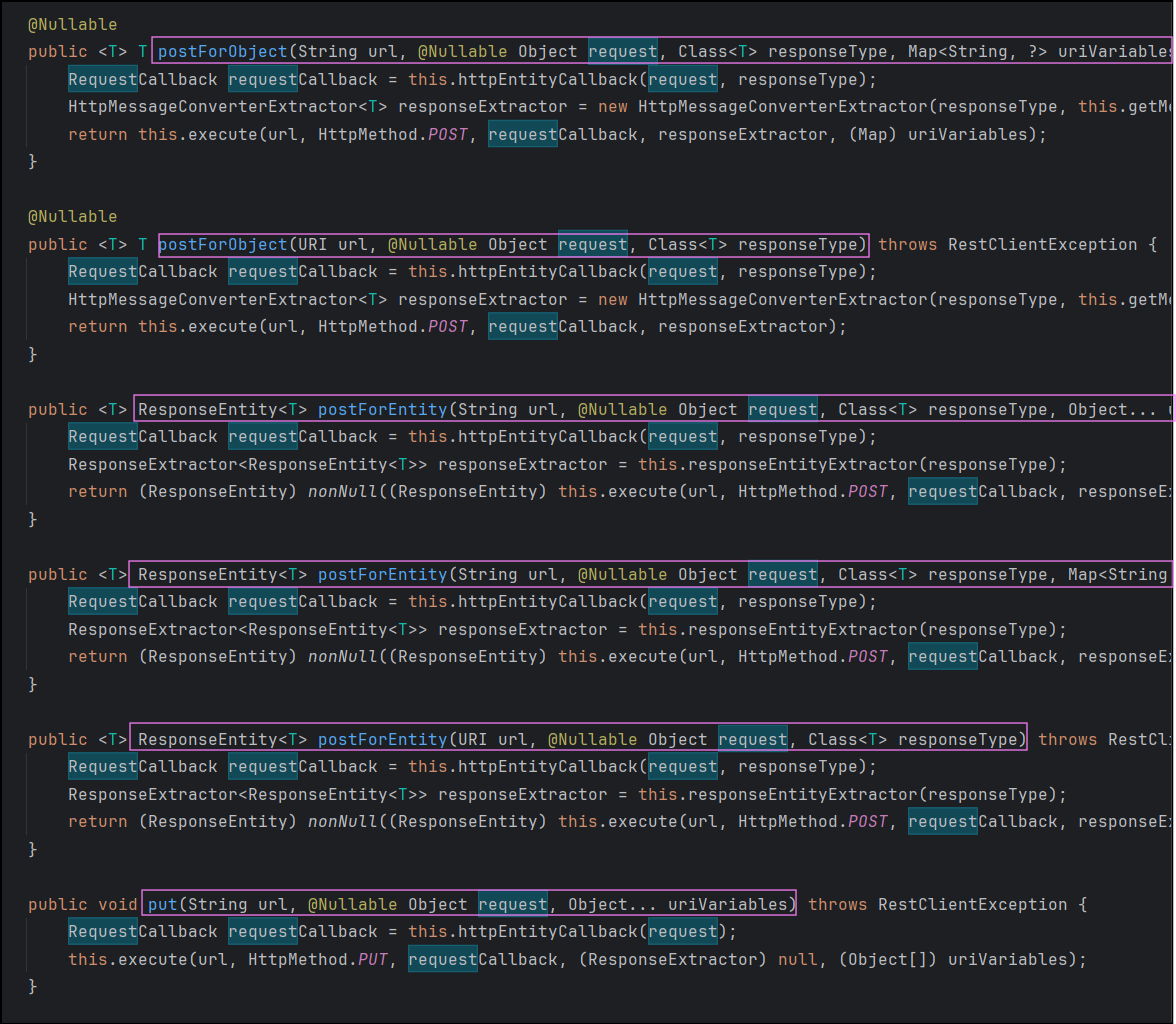POST 메서드는 서버로 데이터를 전송할 때 주로 사용됩니다. 이때 서버는 클라이언트로부터 전달된 데이터를 바탕으로 리소스를 생성하거나 업데이트합니다. 따라서 postForObject와 같은 메서드는 데이터를 전송하기 위한 request body가 필요합니다. (HTTP 요청 본문에 데이터를 포함)