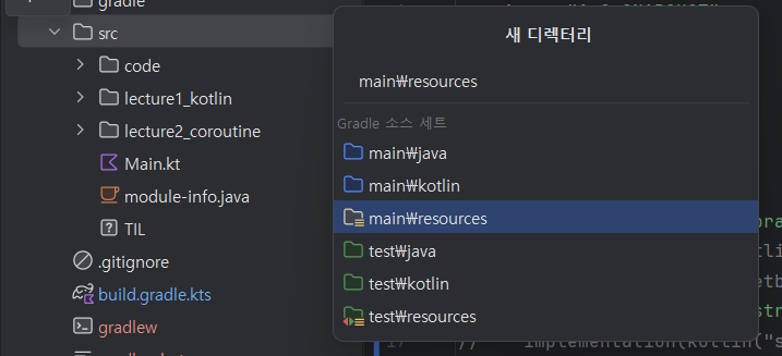 메인 폴더를 만들고 나니 자동으로 kotlin 소스 폴더가 생겼고 (..그랬던것같다 아마도..)