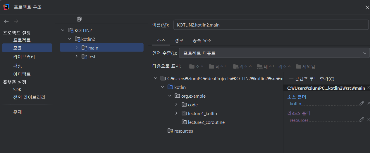 메인 폴더를 만들고 나니 자동으로 kotlin 소스 폴더가 생겼고 (..그랬던것같다 아마도..)