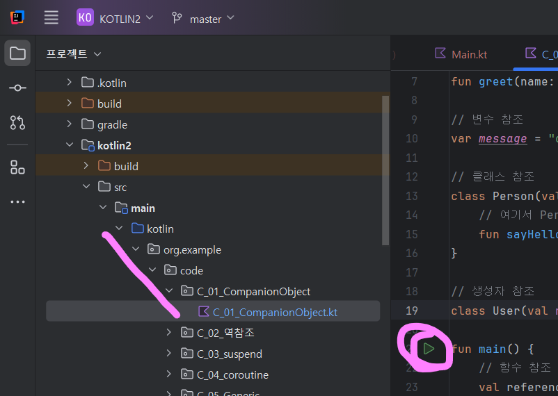 main 옆에 떠야하는 녹색 삼각형 실행 버튼도 없음 ㅠㅠ