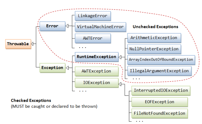 시스템에서 포착 가능하여(try-catch) 복구 가능하며 자바의 경우 예외 처리를 강제합니다. (빨간색 밑줄이 그어지며 컴파일 에러가 발생하는 걸 본 적 있을것이다!)