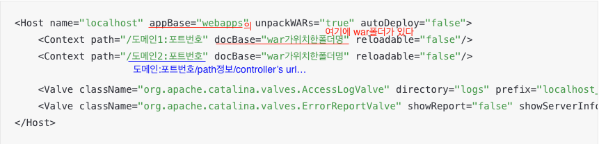 <Context path="/도메인2:포트번호" docBase="war가위치한폴더명" reloadable="false"/>